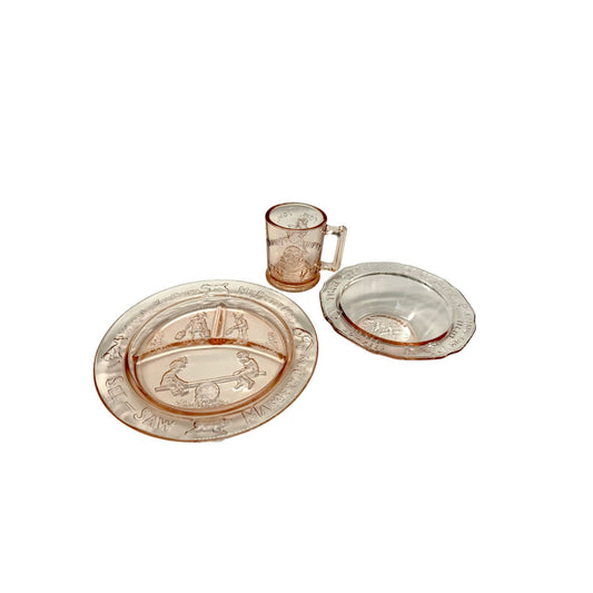 Vintage Tiara Exclusive Humpty Dumpty Cup, Mother Goose Bowl, Jack & Jill Pink Glass Plate Set